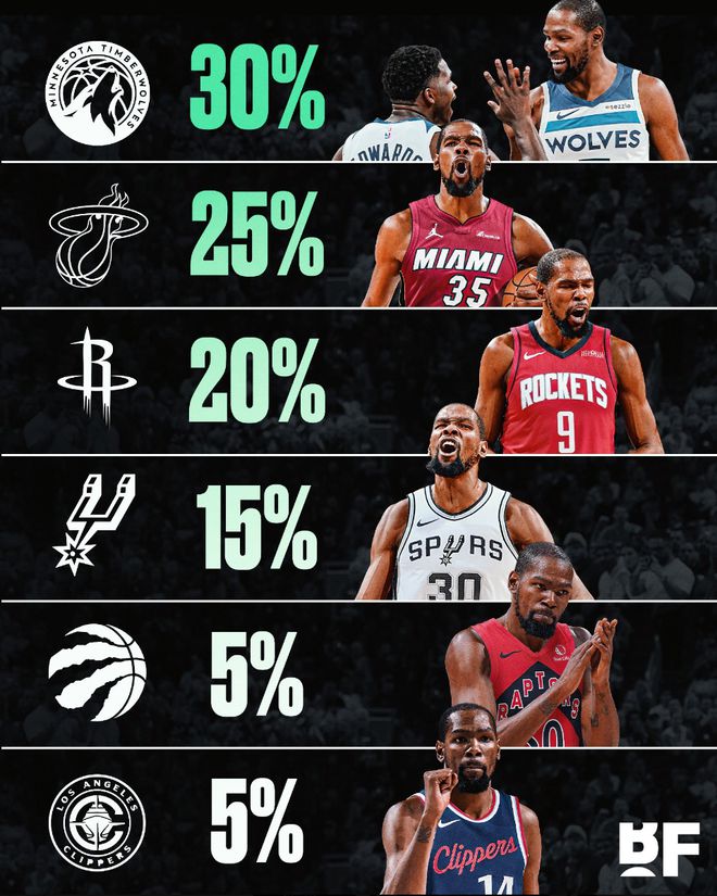 根据BF预测杜兰特下家概率:森林狼30%、热火25%、火箭20%、马刺15%、猛龙5%、快船5%,可见快船交易得到杜兰特的概率并不高,看起来太阳还是对快船的筹码不够满意。